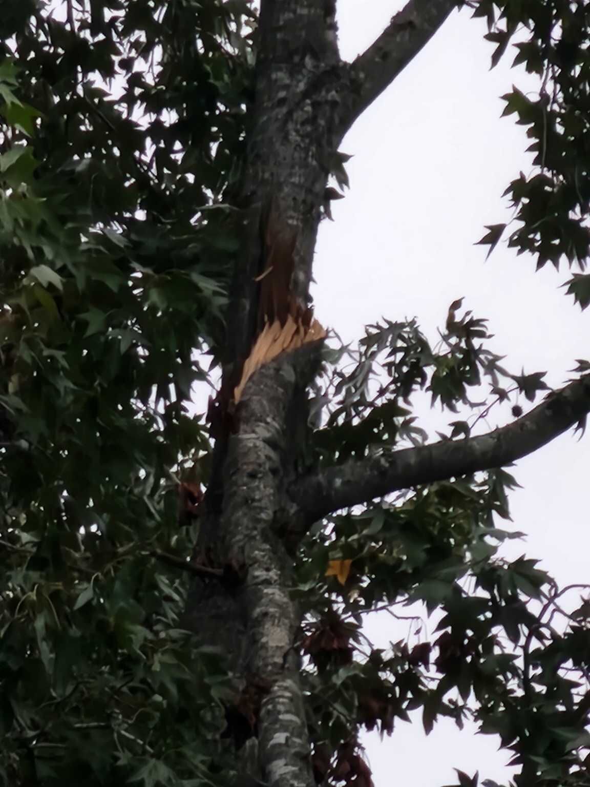A large Gumball tree (approximately 40ft tall) between the edge of Ethridge Manor Blvd and the backyard fence of 724 Woodcott Drive has broken from the wind. It has already dropped several large branches on the Dominion Power transformer box and has more large branches ready to fall. The tree is a major threat to my garage and fence at 728 Woodcott Dr. as well as traffic on Etheridge Manor if they fall in the roadway.