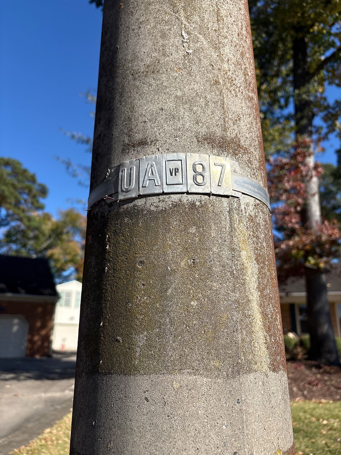 9 digit alpha/numeric # on metal tag on pole: Vavp87