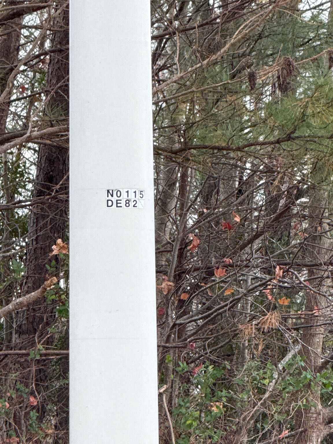 9 digit alpha/numeric # on metal tag on pole: N0115DE82